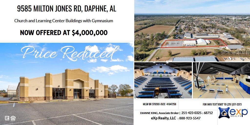 Church & Learning Academy Buildings for Sale in Daphne, AL (27,317 SF) This exceptional property offers a prime opportunity for a religious organization, school, fitness center or other special purpose venture. Extensive square footage over 3 buildings featuring the Church Sanctuary, classrooms, gymnasium, kitchen & plenty of storage. Ample parking. Located on 3.2 acres in the City of Daphne, this great property is convenient to retail centers, restaurants, and the Mobile Bay front. Also, offers an easy commute to Mobile, AL & Pensacola, FL. Call Dianne at (251)423-0325 for more information.